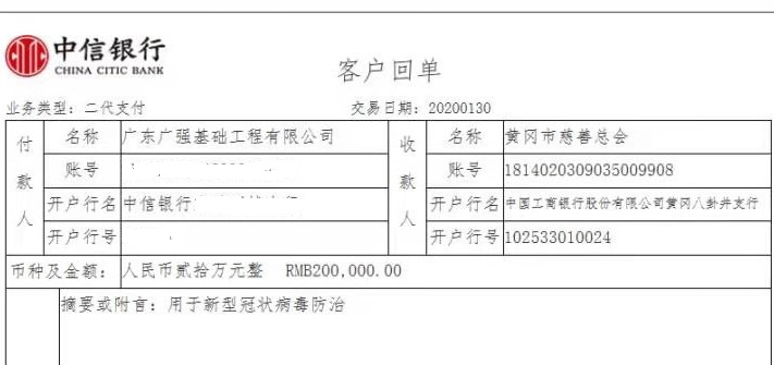 廣東廣強(qiáng)公司向湖北黃岡市慈善總會(huì)捐款20萬(wàn)元